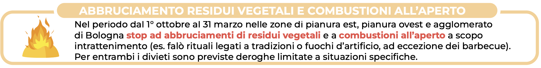 Maggiori indicazioni riguardo le deroghe al divieto di abbruciamento sono contenute nella pagina web di cui al seguente indirizzo: https://ambiente.regione.emilia-romagna.it/it/aria/pair-2030/abbruciamenti. L'abbruciamento deve essere sempre comunicato, come previsto dalla normativa vigente, consultabile alla pagina web: https://ambiente.regione.emilia-romagna.it/it/parchi-natura2000/foreste/gestione-forestale/abbruciamenti