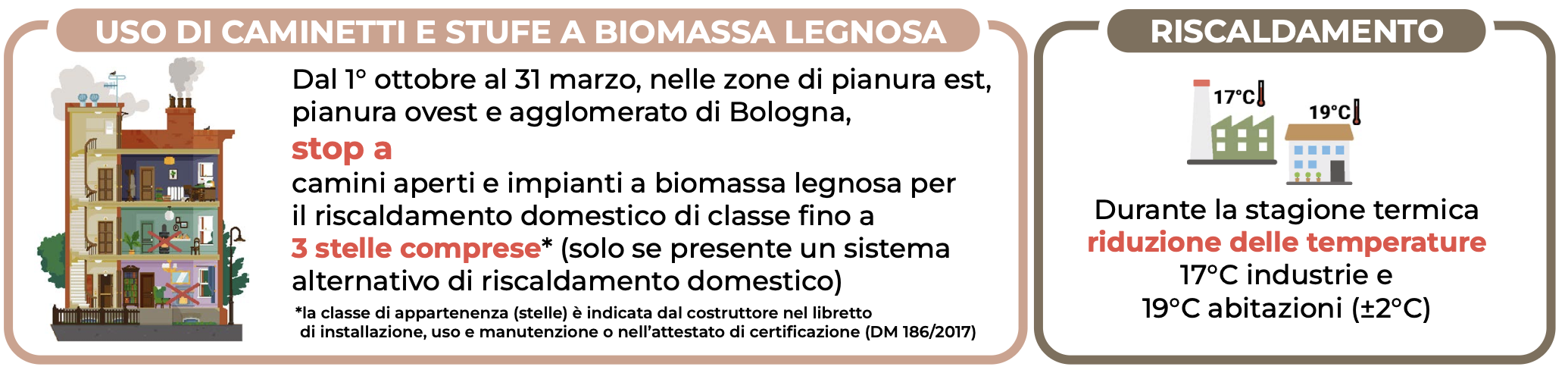 Nel periodo dal 01/10/2025 al 31/03/2026, in tutto il territorio comunale, il divieto di utilizzare, nelle unità immobiliari comunque classificate (da E1 a E8) in presenza di impianto di riscaldamento alternativo, generatori di calore domestici alimentati a biomassa legnosa aventi prestazioni energetiche ed emissive che non sono in grado di rispettare i valori previsti almeno per la classe “4 stelle” e focolari aperti o che possono funzionare aperti.